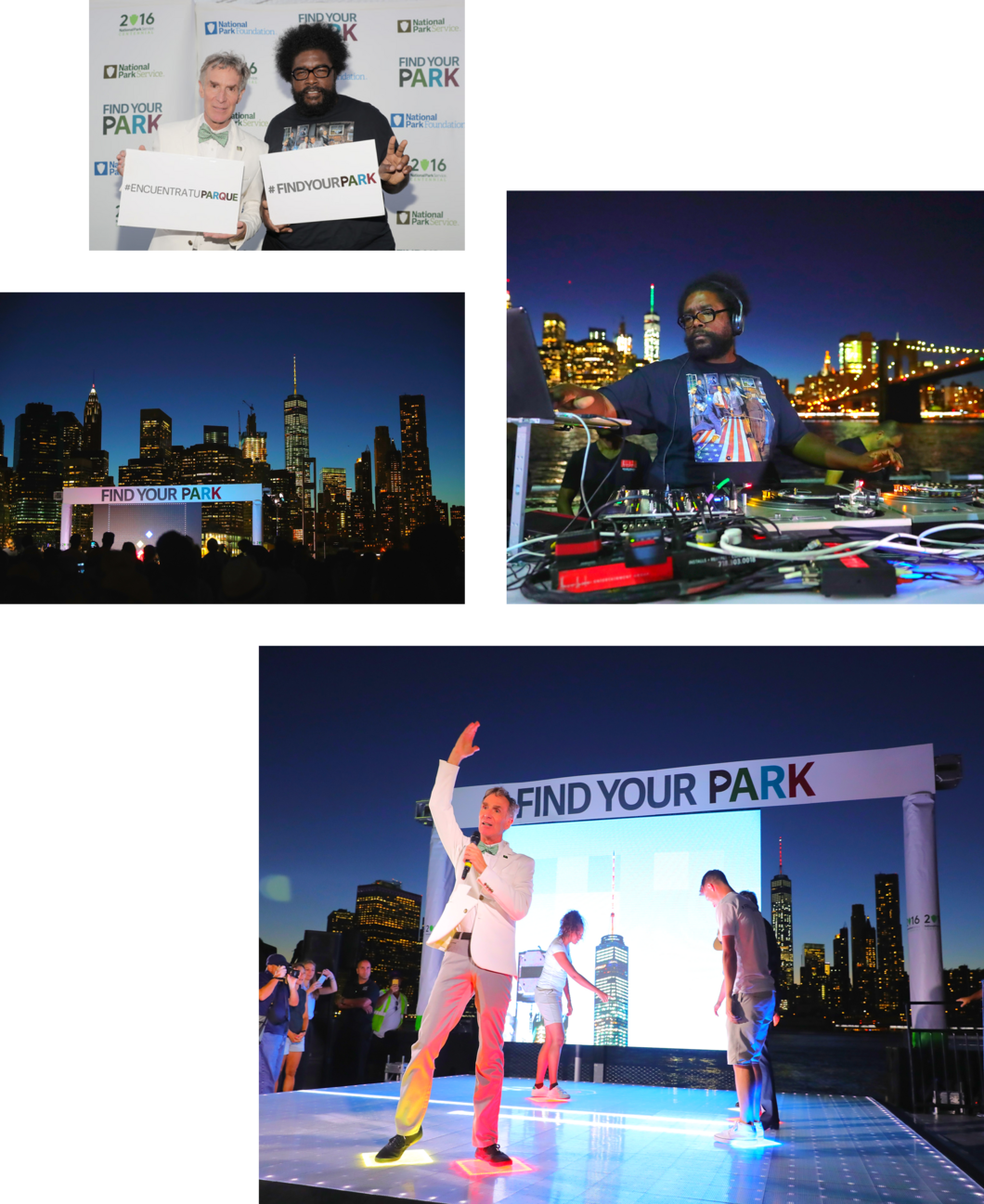 The National Park Service celebrated their Centennial at Brooklyn Bridge Park on 22 August 2016. The event featured an interactive game which involved utilizing Spireworks to light up the spire at One World Trade Center. Remarks were made by Bill Nye, U.S. Secretary of the Interior Sally Jewell, Will Shafroth (National Park Foundation President), Regina Myer (Brooklyn Bridge Park President), Helena Durst, among others, as well as a musical performance by QuestLove.