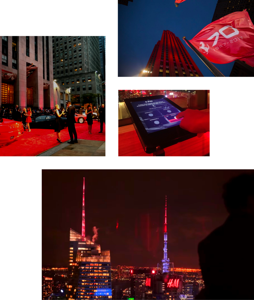 Ferrari celebrated its 70th Anniversary with an event that featured an elevated and integrated Spireworks experience for guests. The event showcased 70 of Ferrari's classic cars in five exhibits spread throughout the city. A custom-branded iPad interface allowed guests to take over all of Spireworks' New York City spires with specialized Ferrari themes to celebrate the anniversary and engage guests. Ferrari's event was in partnership with international humanitarian organization Save the Children in powering a child's ability to achieve their dreams.
